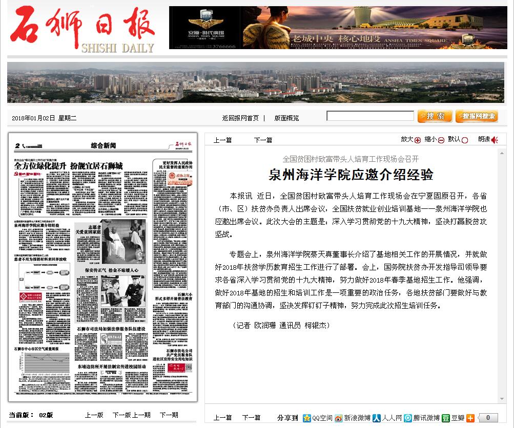 石狮日报讯 近日,全国贫困村致富带头人培育工作现场会在宁夏固原召开,各省(市、区)扶贫办负责人出席会议,全国扶贫就业创业培训基地——泉州海洋学院也应邀出席会议。此次大会的主题是:深入学习贯彻党的十九大精神,坚决打赢脱贫攻坚战。