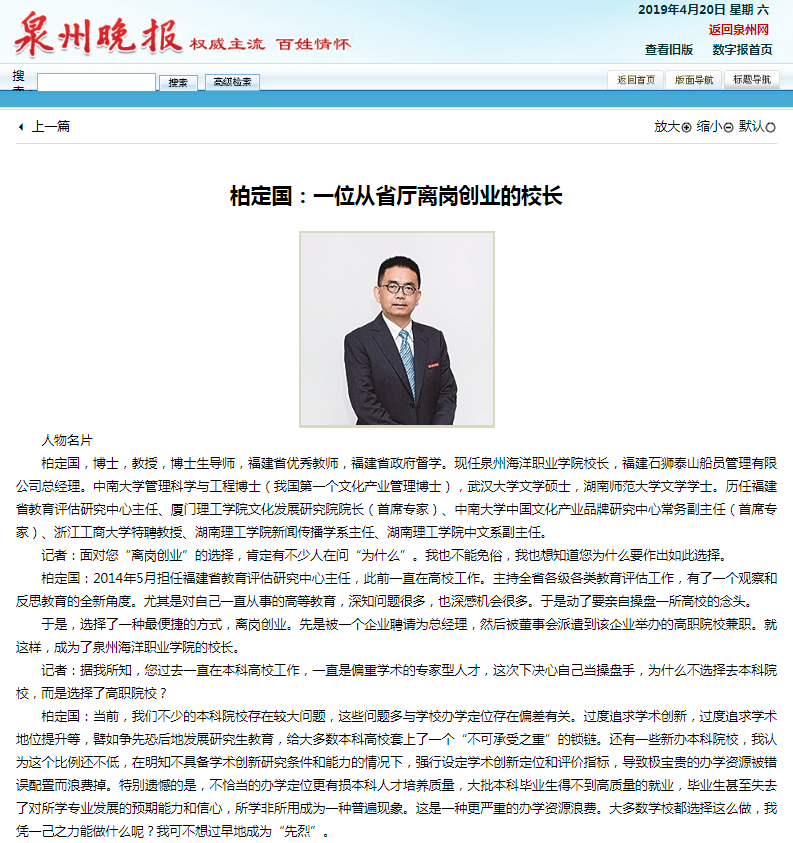 【泉州晚报】柏定国:一位从省厅离岗创业的校长