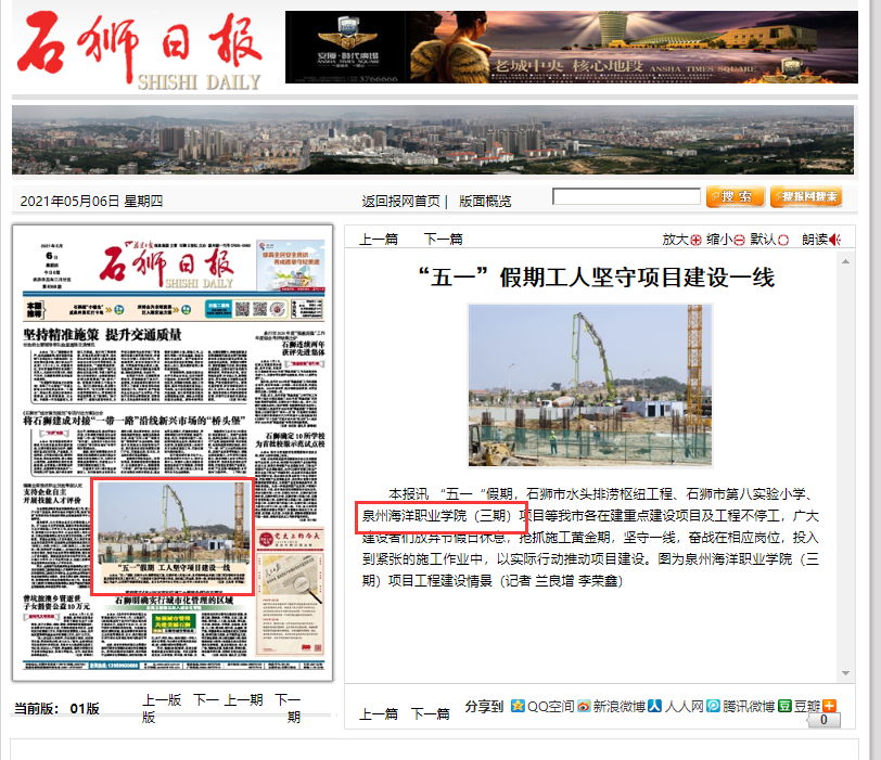 【石狮日报】“五一”假期工人坚守项目建设一线
