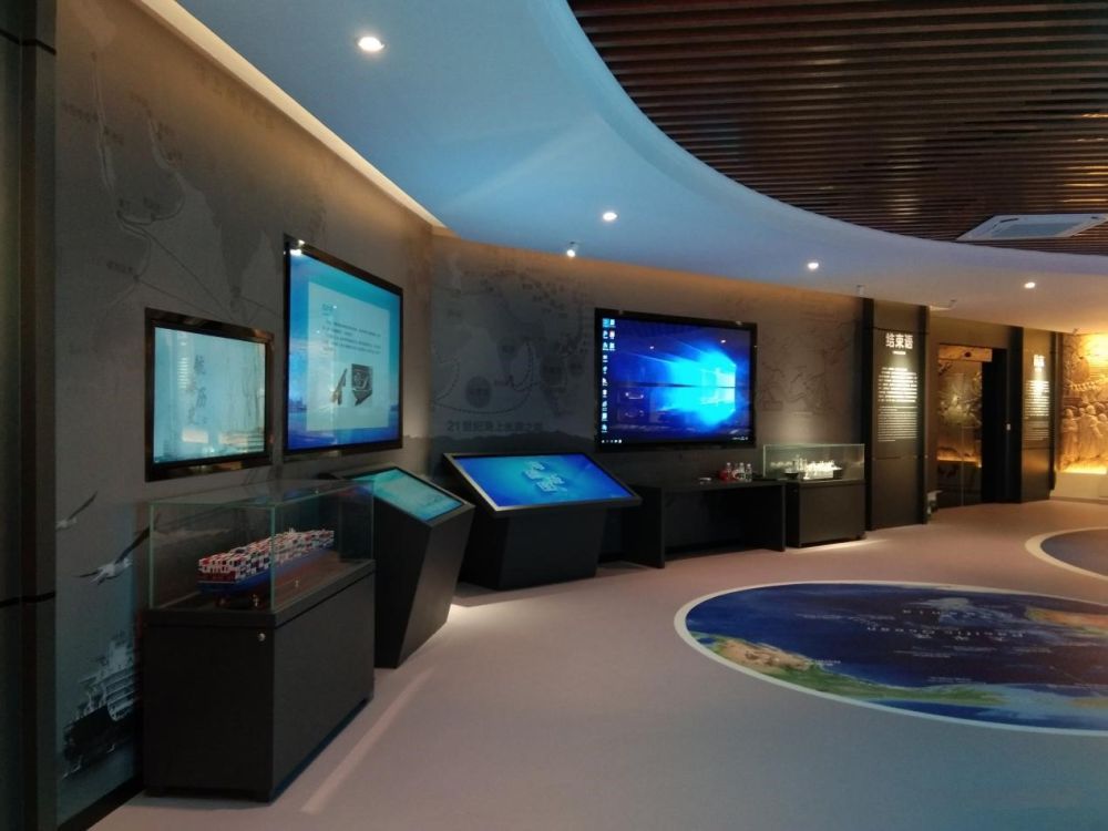 位于整个场馆中心展区的巨型海疆电子沙盘,重点展示我国近三百万平方公里蓝色国土的壮阔景象,特别展示我国南海九段线、以及出海口岛链、台湾岛、钓鱼岛、黄岩岛等重要岛屿。LED沙盘上摆放郑和下西洋船队、“山东舰”航母舰队和最先进的国产商船等模型,跨越时空,古代海上丝绸之路和现代海洋强国之路交相呼应。