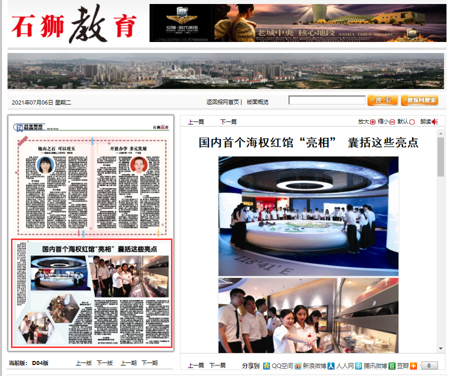 听说泉州海洋职业学院建设了国内首个高校内的海权红馆,并于6月29日正式开馆,同时举行了表彰大会。当日,记者前往一探究竟。走进海权红馆,一股现代化与历史感交融的气息扑面而来。精雕细琢的浮雕映入眼帘,数十艘历史航模陈列在展柜,搭配详细的图文介绍、背景展示,数块显示屏滚动播放相关历史信息,地胶上详细的地图、中间梦幻的海疆沙盘……置身其中,感受中华海权历史的跌宕起伏,对祖国建设海上强国,实现民族复兴宏伟蓝图的自豪感油然而生。