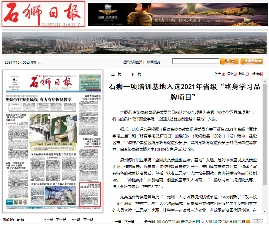 【石狮日报】石狮一项培训基地入选2021年省级“终身学习品牌项目”