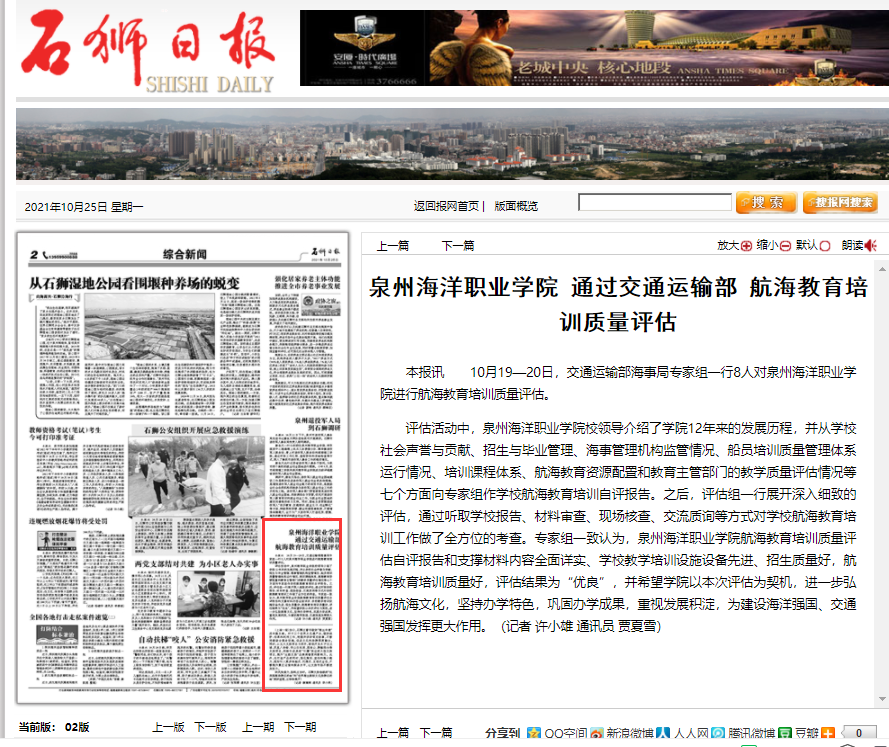 【石狮日报】泉州海洋职业学院通过交通运输部航海教育培训质量评估