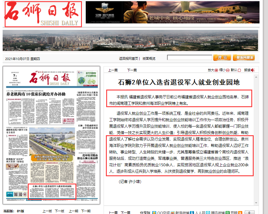 【石狮日报】石狮2单位入选省退役军人就业创业园地