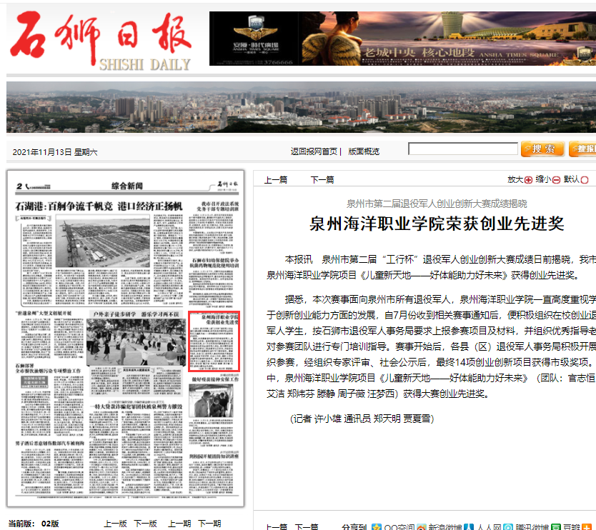 【石狮日报】泉州海洋职业学院荣获创业先进奖