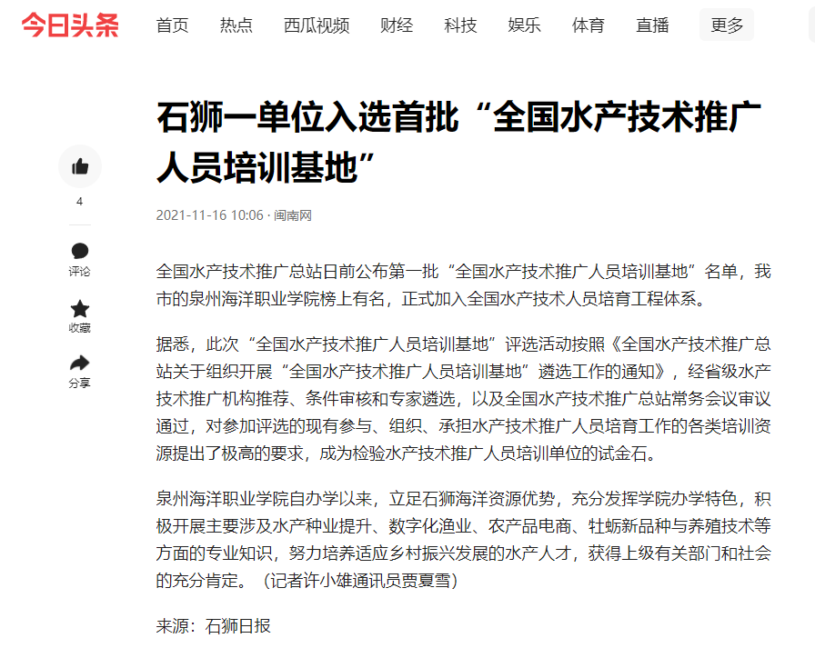 【今日头条】石狮一单位入选首批 “全国水产技术推广人员培训基地”