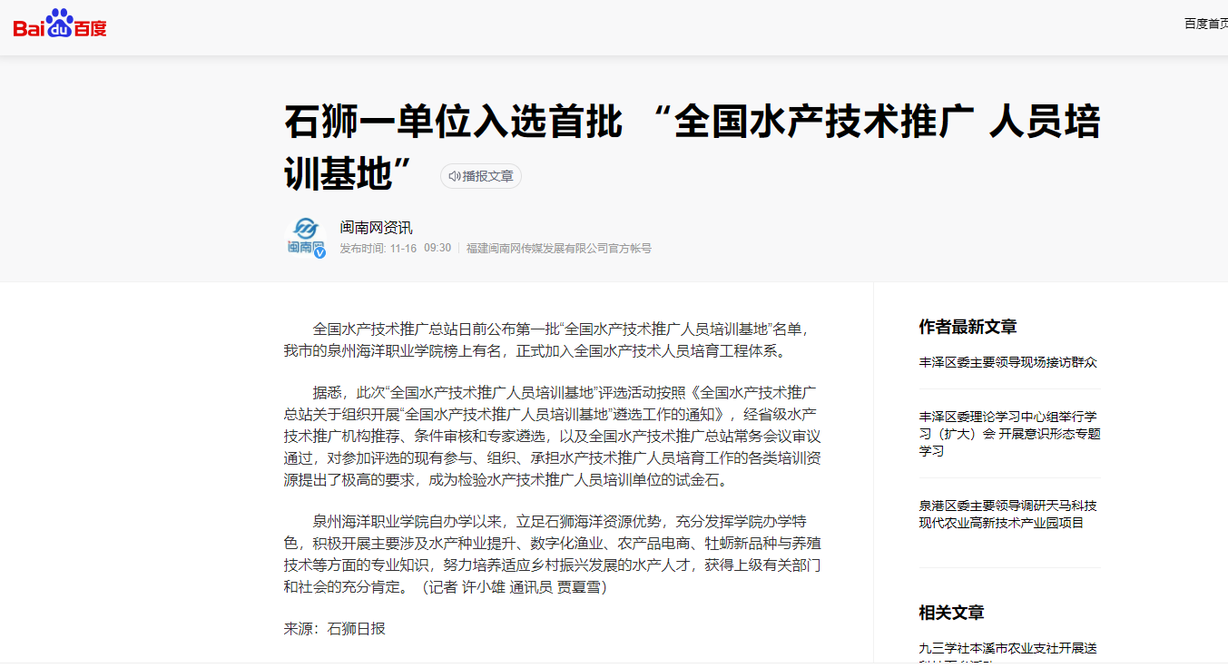 【百度新闻】石狮一单位入选首批 “全国水产技术推广人员培训基地”