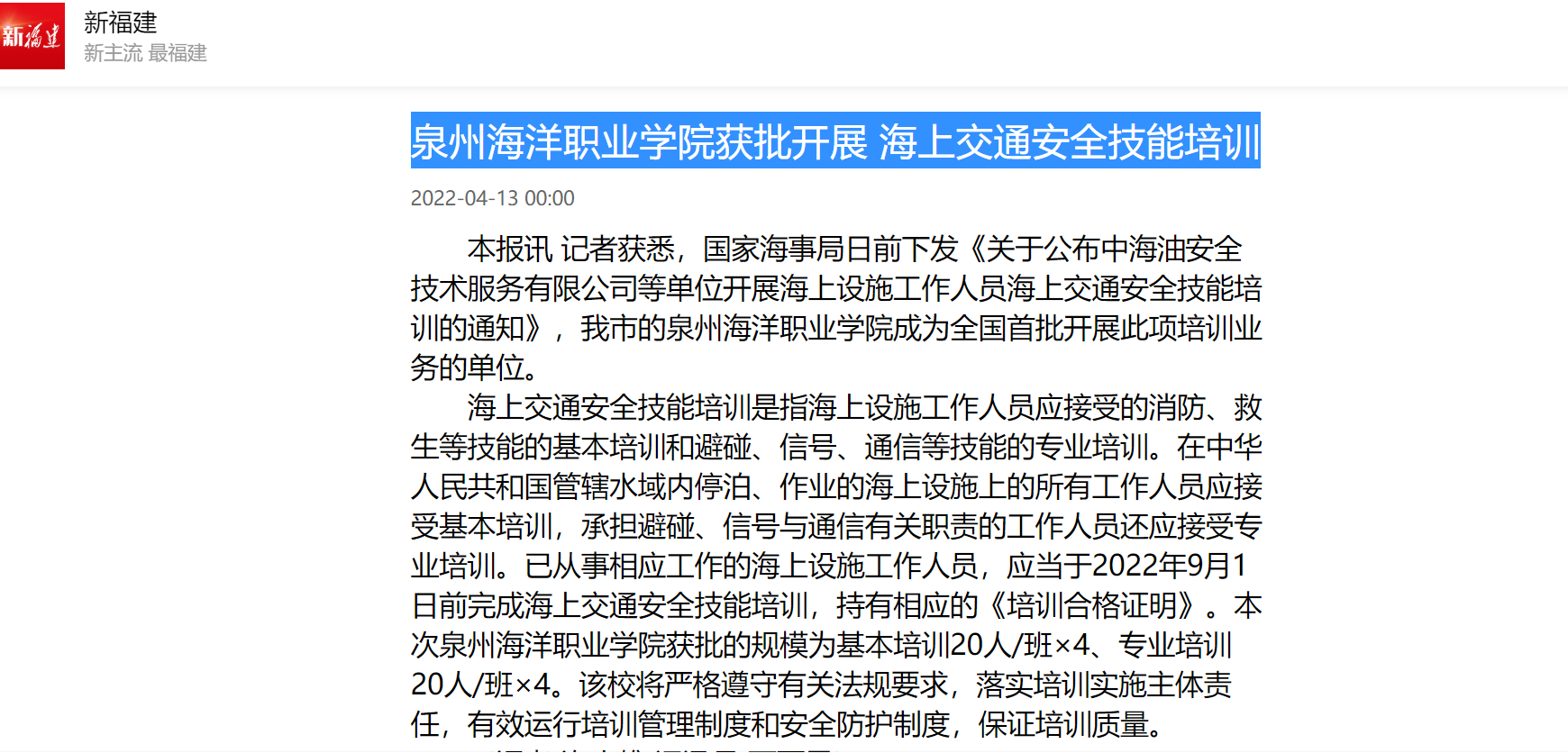 【新福建】泉州海洋职业学院获批开展 海上交通安全技能培训