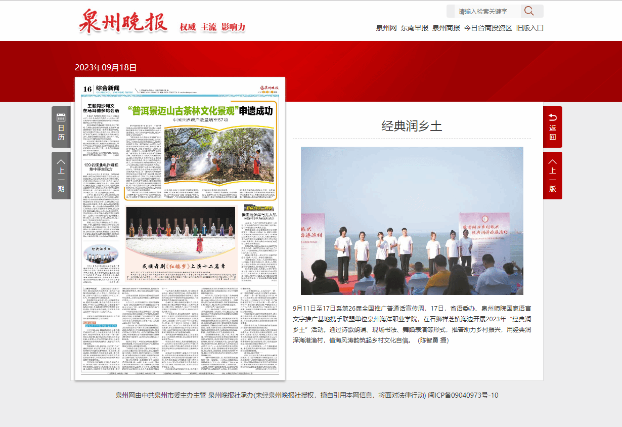 9月11日至17日系第26届全国推广普通话宣传周,17日,省语委办、泉州师院国家语言文字推广基地携手联盟单位泉州海洋职业学院,在石狮祥芝镇海边开展2023年“经典润乡土”活动。通过诗歌朗诵、现场书法、舞蹈表演等形式,推普助力乡村振兴,用经典润泽海港渔村,借海风涛韵筑起乡村文化自信。(陈智勇 摄)