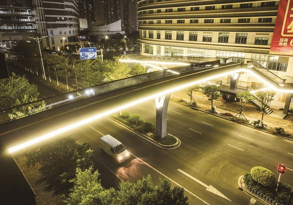 石狮花园路人行天桥工程于近日全部完工。夜幕来临,天桥亮起彩灯,来往车辆穿梭于下,一派车水马龙。(记者 李荣鑫)