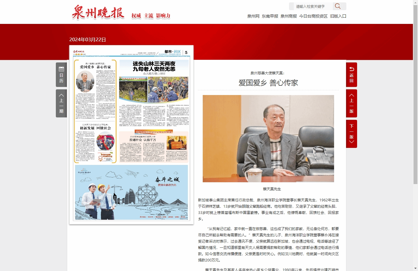 “从我有记忆起,家中就一直在做慈善,这也成了我们的家教,无论身处何方,都要尽自己所能去帮助有需要的人。”蔡天真先生的儿子、泉州海洋职业学院董事蔡永鸿在接受记者采访时表示,过去通讯不便,父亲就算远在新加坡,也会通过电视、电话等途径了解国内情况,一旦知道哪里有天灾人祸需要捐款帮助的事情,他们家都会通过电话进行捐款。如今信息交流传播便捷,父亲更是时时关心。例如汶川地震时,他就第一时间向灾区捐款200万元。