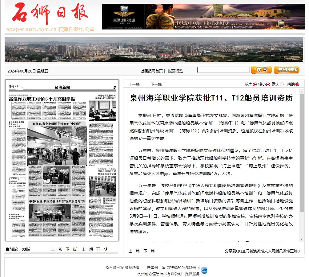 近年来,泉州海洋职业学院积极响应低碳环保的倡议,满足航运业对T11、T12持证船员日益增长的需求,致力于推动现代船舶科学技术的革新与创新。在各级海事主管机关的指导和学院董事会领导下,学校紧跟“海上福建”“海上泉州”建设步伐,聚焦涉海类人才培养,每年开展各类培训超4.5万人次。