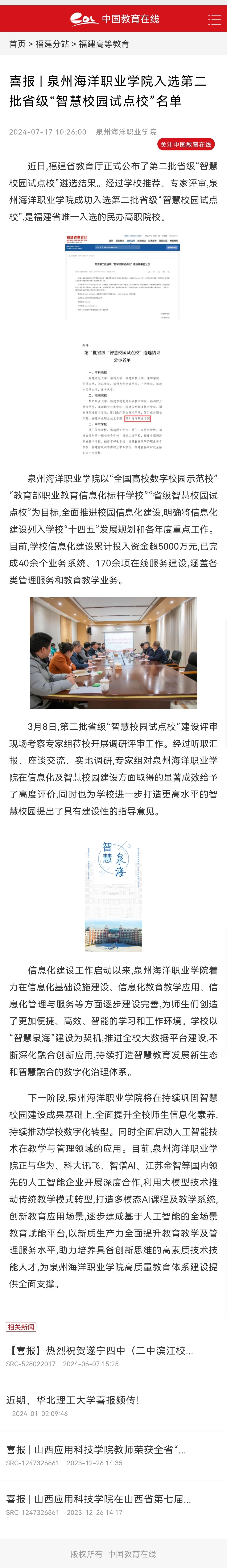 【中国教育在线】喜报 泉州海洋职业学院入选第二批省级“智慧校园试点校”名单