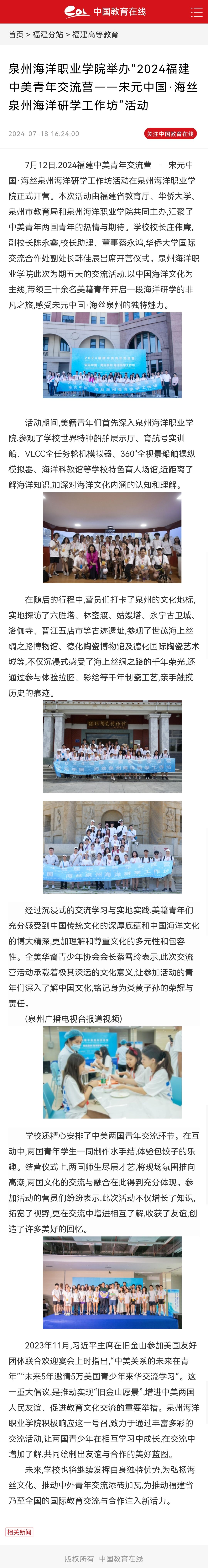 【中国教育在线】泉州海洋职业学院举办“2024福建中美青年交流营——宋元中国·海丝泉州海洋研学工作坊”活动