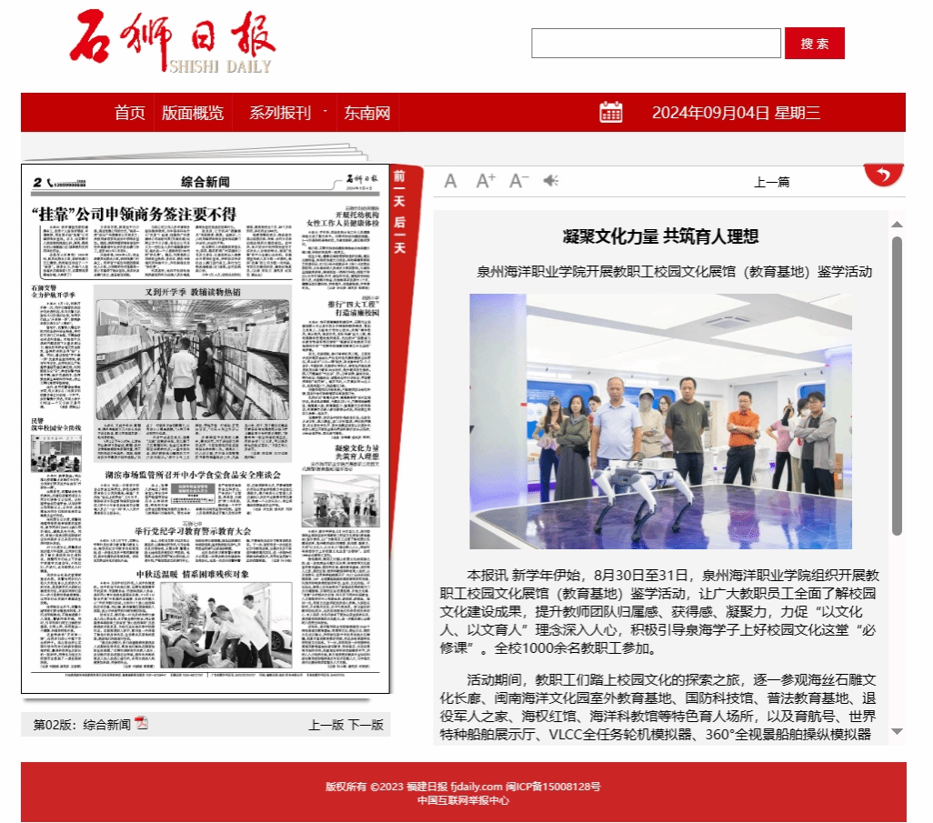 近年来,泉州海洋职业学院陆续建设50余个特色展馆及教育基地,将海洋文化、海丝文化、海权文化充分融合,并积极弘扬中华优秀传统文化精髓,积累丰富的教育教学资源,形成具有泉海特色的校园文化体系。下一步,学校将进一步挖掘特色展馆及教育基地在通识教育、科学普及、文化传承等方面的作用,设置相应学科的实践教学环节,并纳入人才培养方案,聚力培养更多兼具专业知识和综合素质的涉海类高水平技术技能人才,为中国式现代化建设提供智慧及人才支撑。