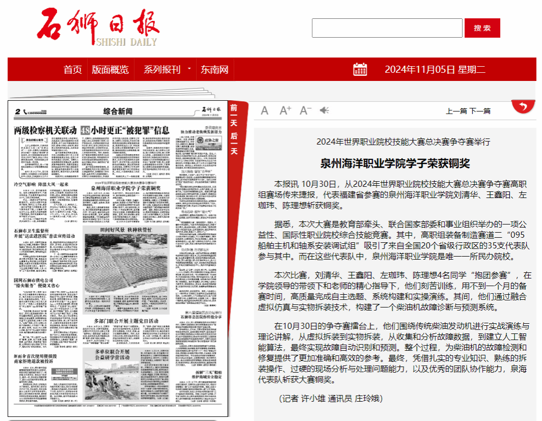 【石狮日报】泉州海洋职业学院学子荣获铜奖