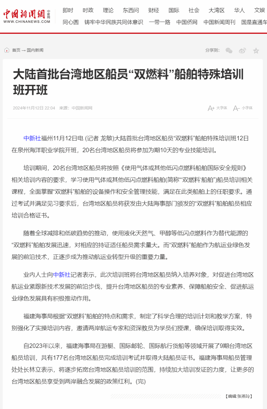 【中国新闻网】大陆首批台湾地区船员“双燃料”船舶特殊培训班开班
