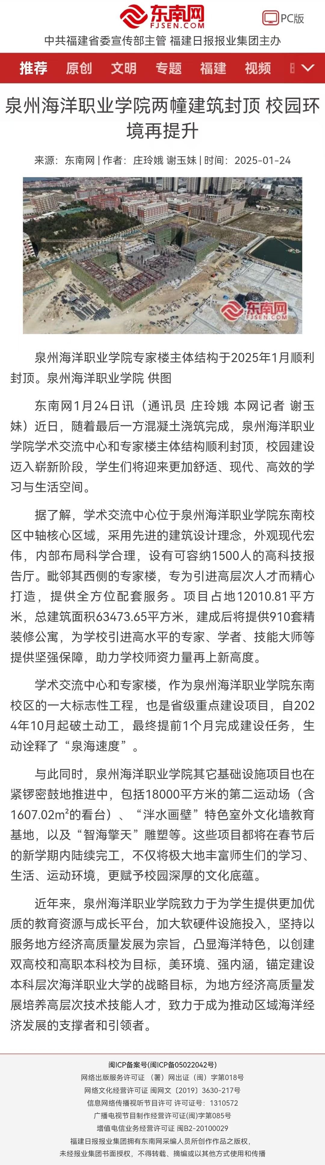 【中国新闻网】泉州海洋职业学院学术交流中心和专家楼主体结构封顶