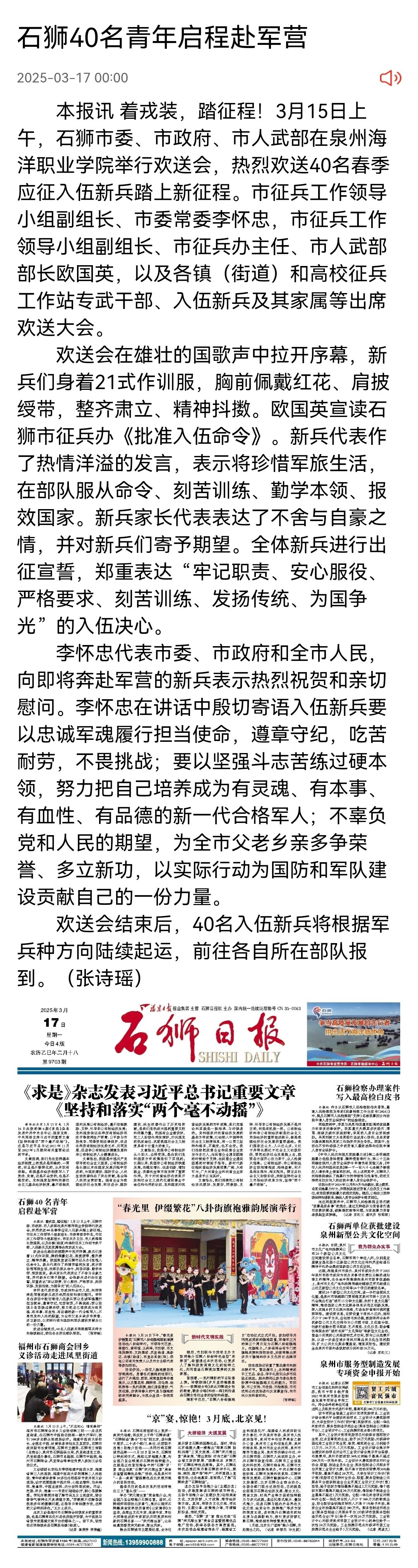 【石狮日报】石狮40名青年启程赴军营