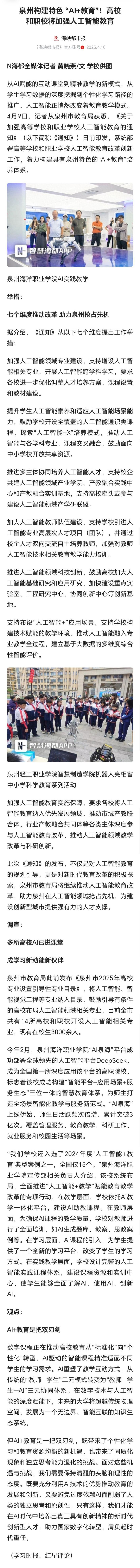 【海峡都市报】泉州构建特色 “AI+教育”!高校和职校将加强人工智能教育