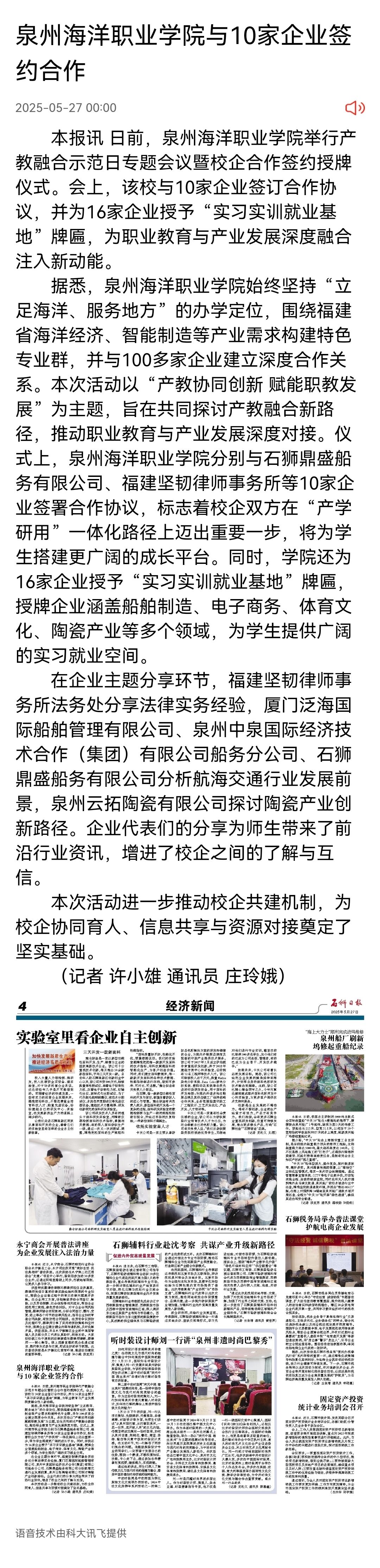 【新福建客户端】泉州海洋职业学院与10家企业签约合作