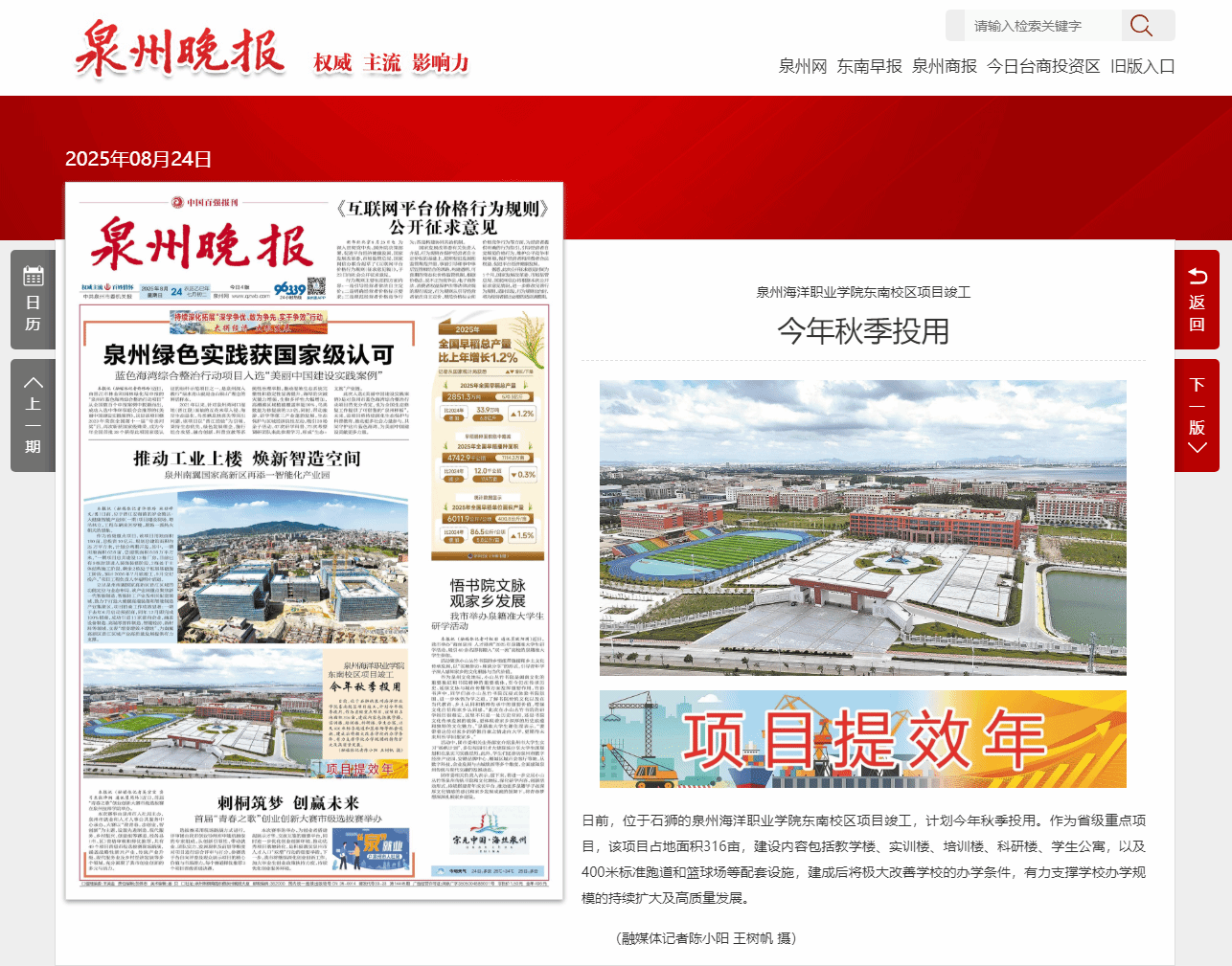 【泉州晚报】泉州海洋职业学院东南校区项目竣工 今年秋季投用