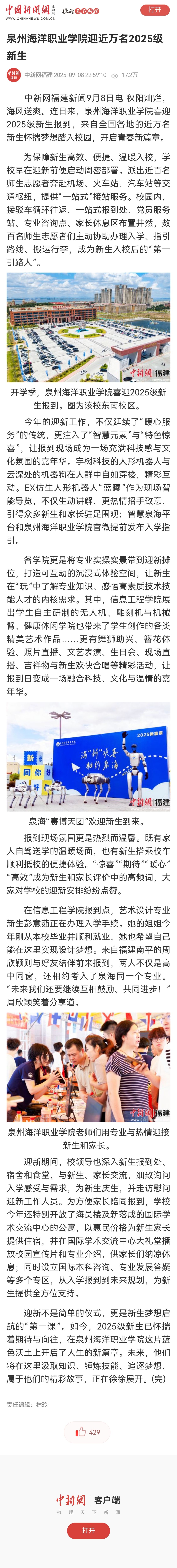 【中国新闻网】泉州海洋职业学院迎近万名2025级新生