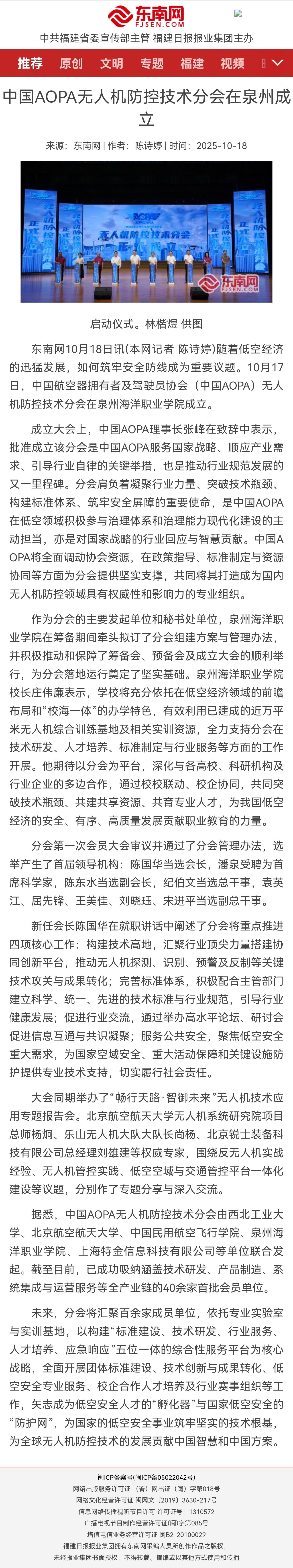 【东南网】中国AOPA无人机防控技术分会在泉州成立