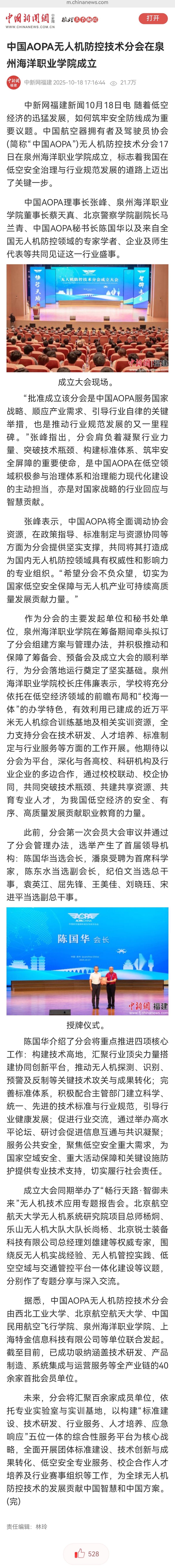 【中国新闻网】中国AOPA无人机防控技术分会在泉州海洋职业学院成立