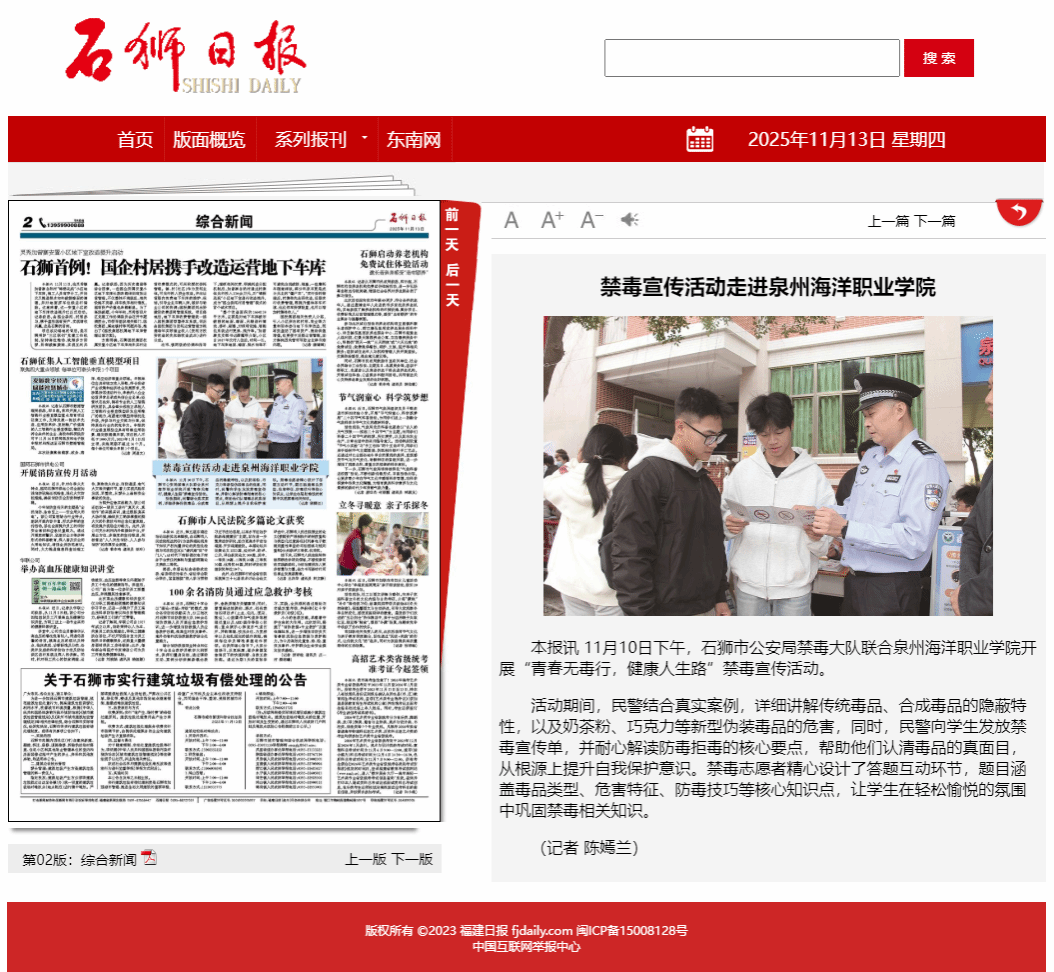 【石狮日报】禁毒宣传活动走进泉州海洋职业学院