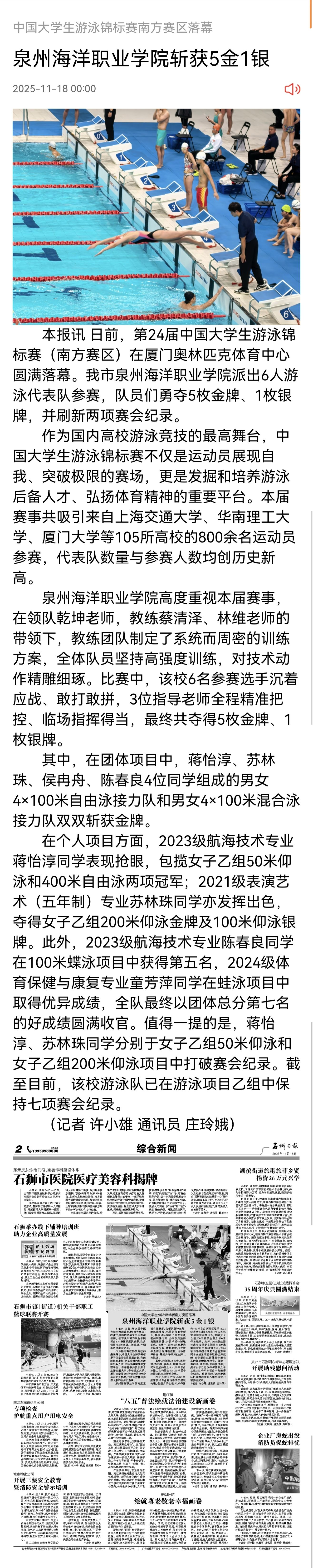 【新福建客户端】中国大学生游泳锦标赛南方赛区落幕 泉州海洋职业学院斩获5金1银