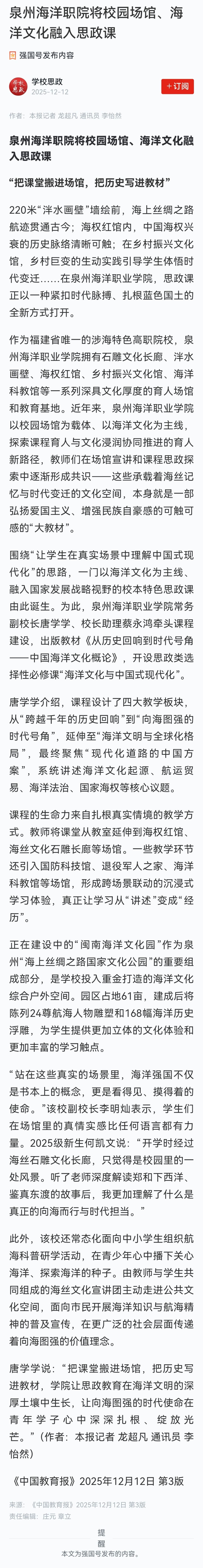 【中国教育报】泉州海洋职院将校园场馆、海洋文化融入思政课 “把课堂搬进场馆,把历史写进教材”