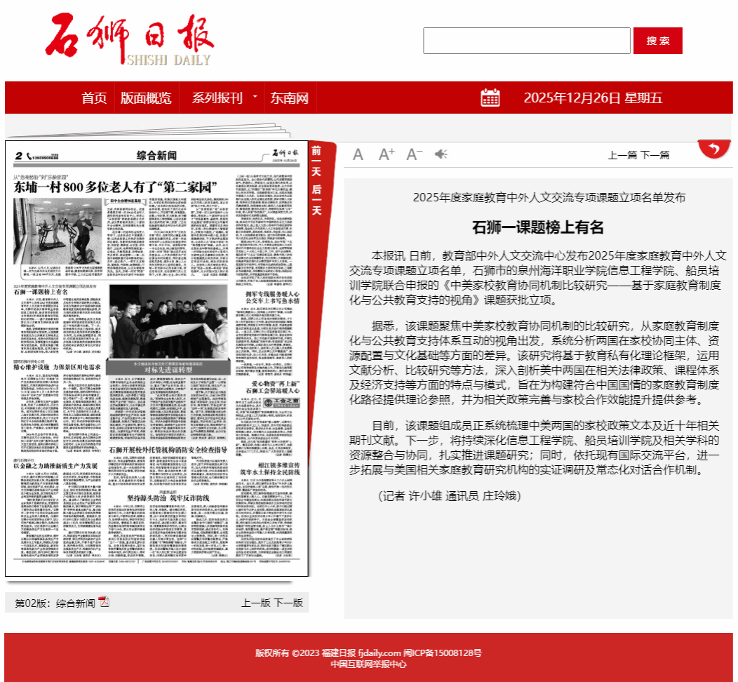 【石狮日报】2025年度家庭教育中外人文交流专项课题立项名单发布 石狮一课题榜上有名