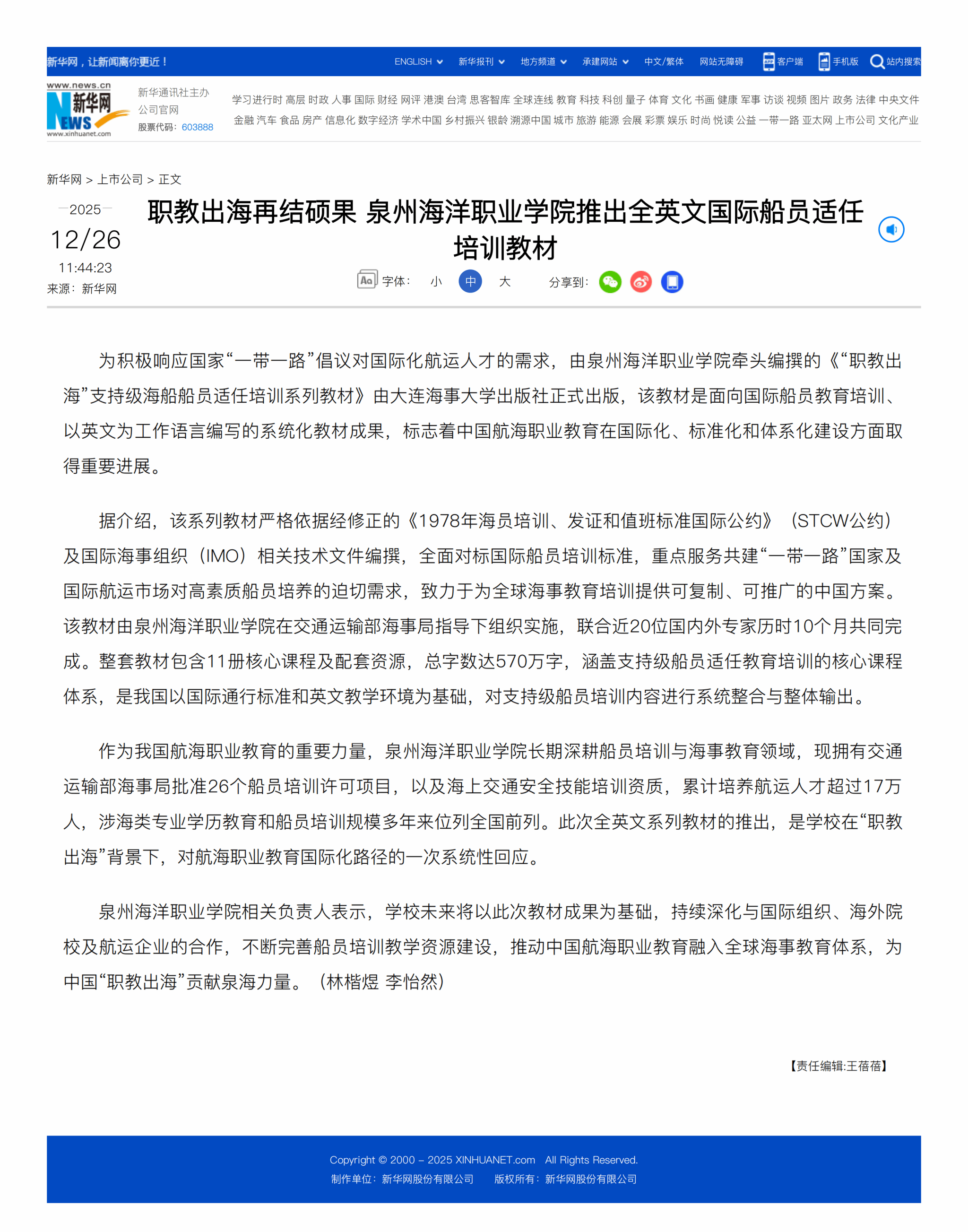 【新华网】职教出海再结硕果 泉州海洋职业学院推出全英文国际船员适任培训教材