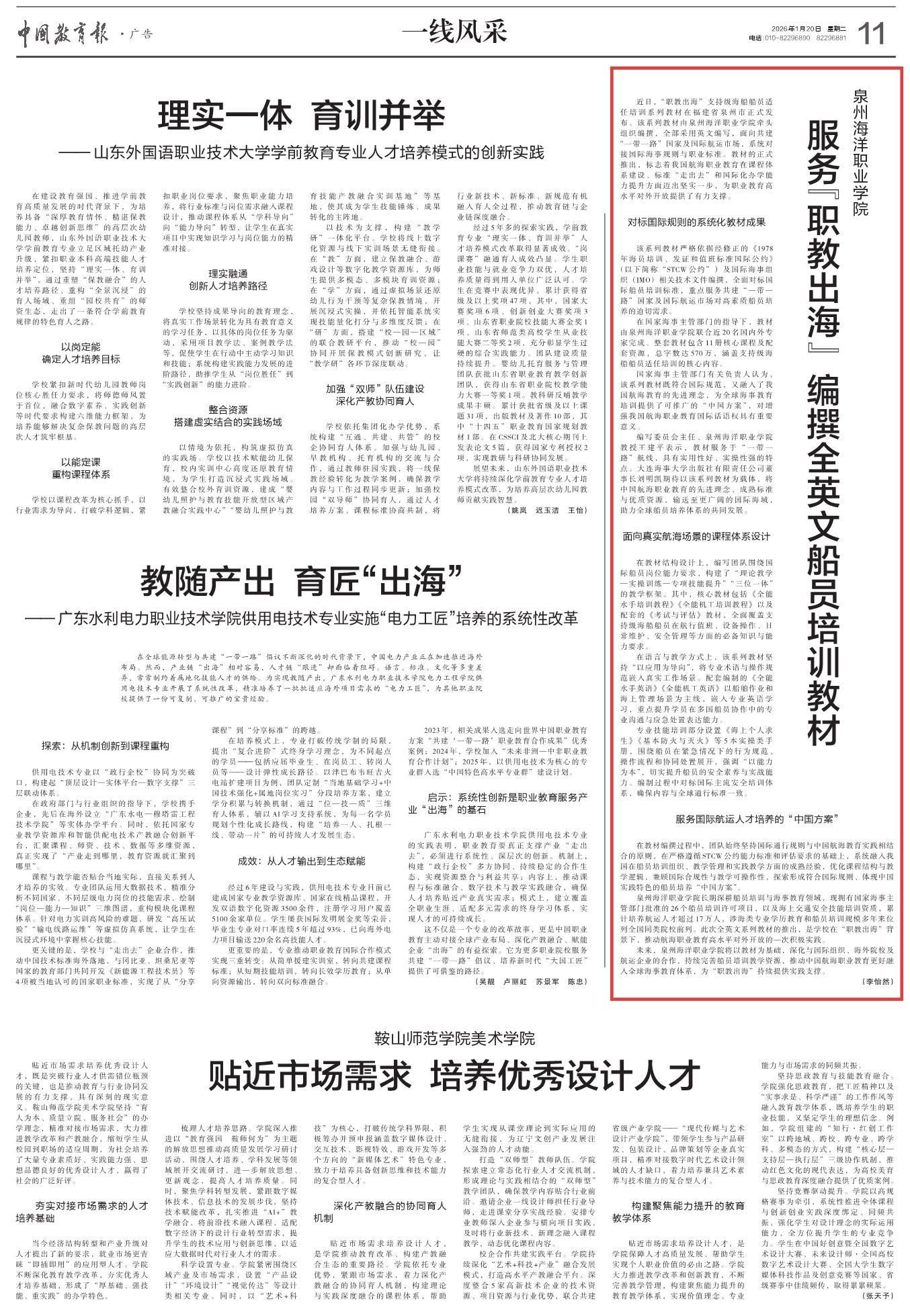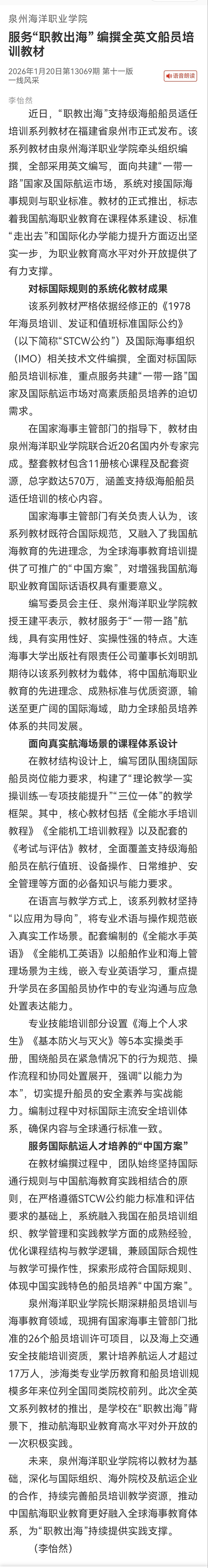 【中国教育报】泉州海洋职业学院服务“职教出海” 编撰全英文船员培训教材