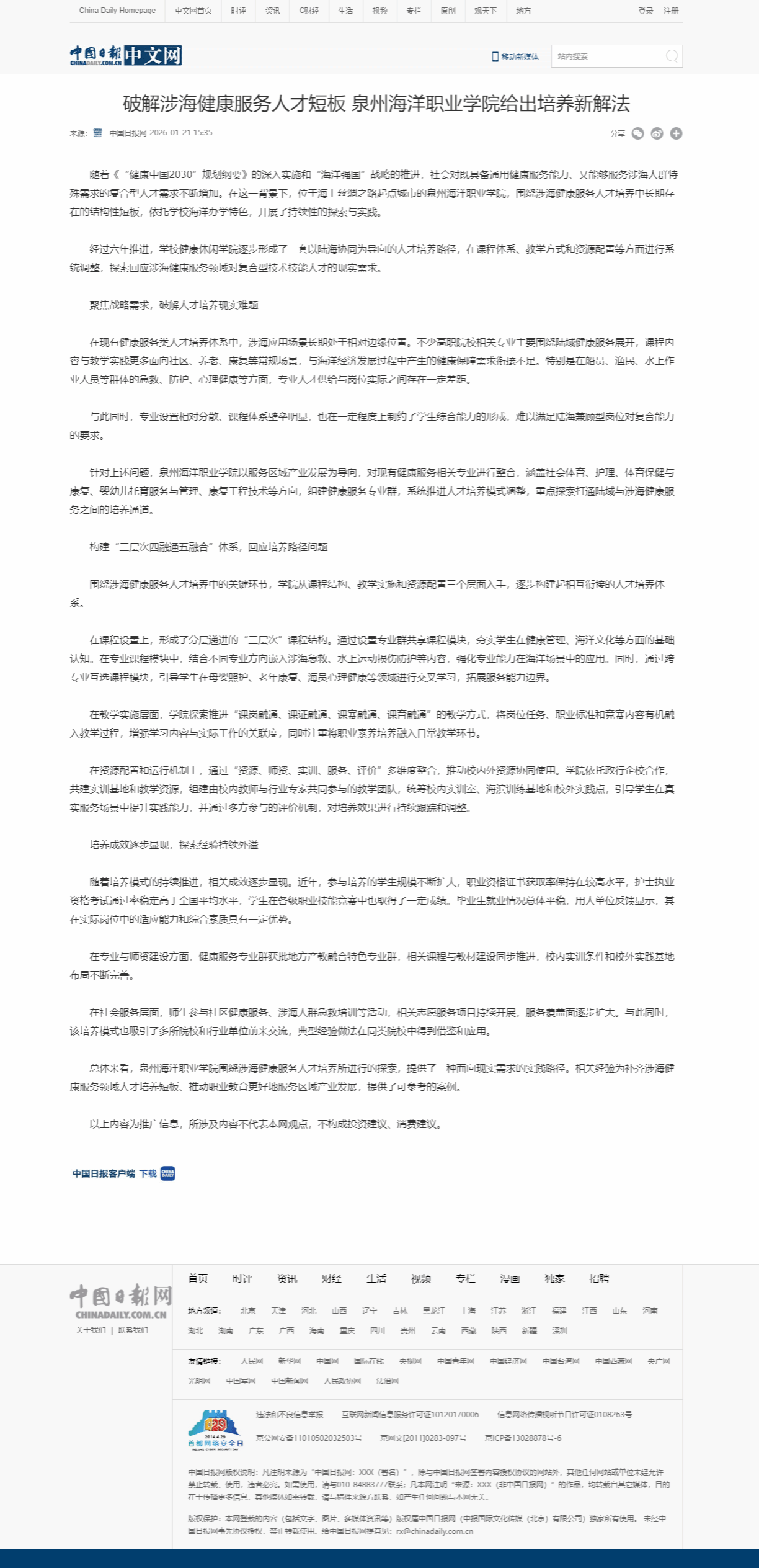 【中国日报网】破解涉海健康服务人才短板 泉州海洋职业学院给出培养新解法