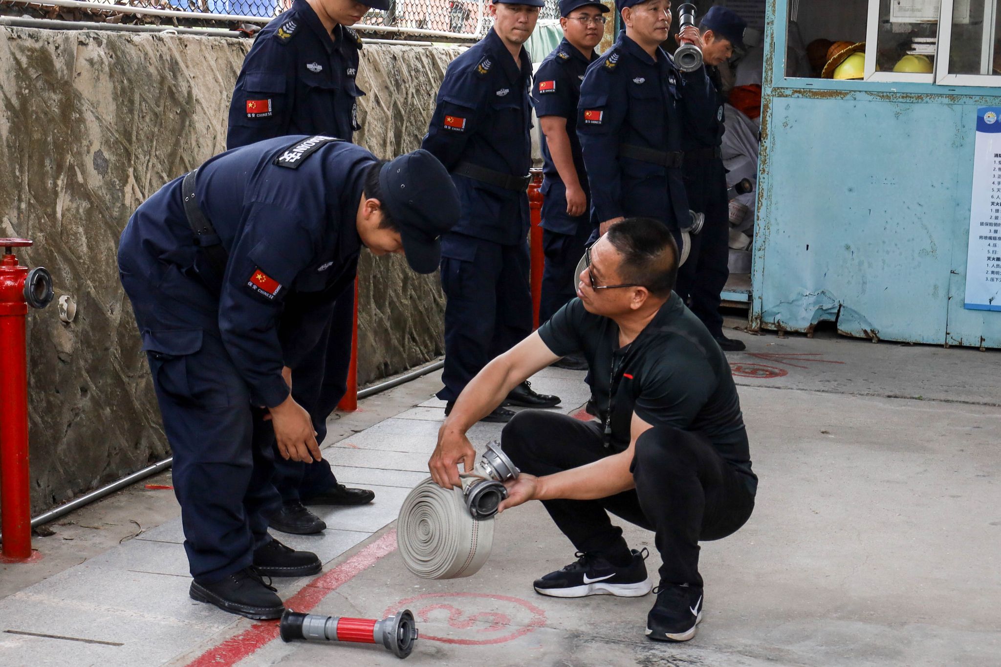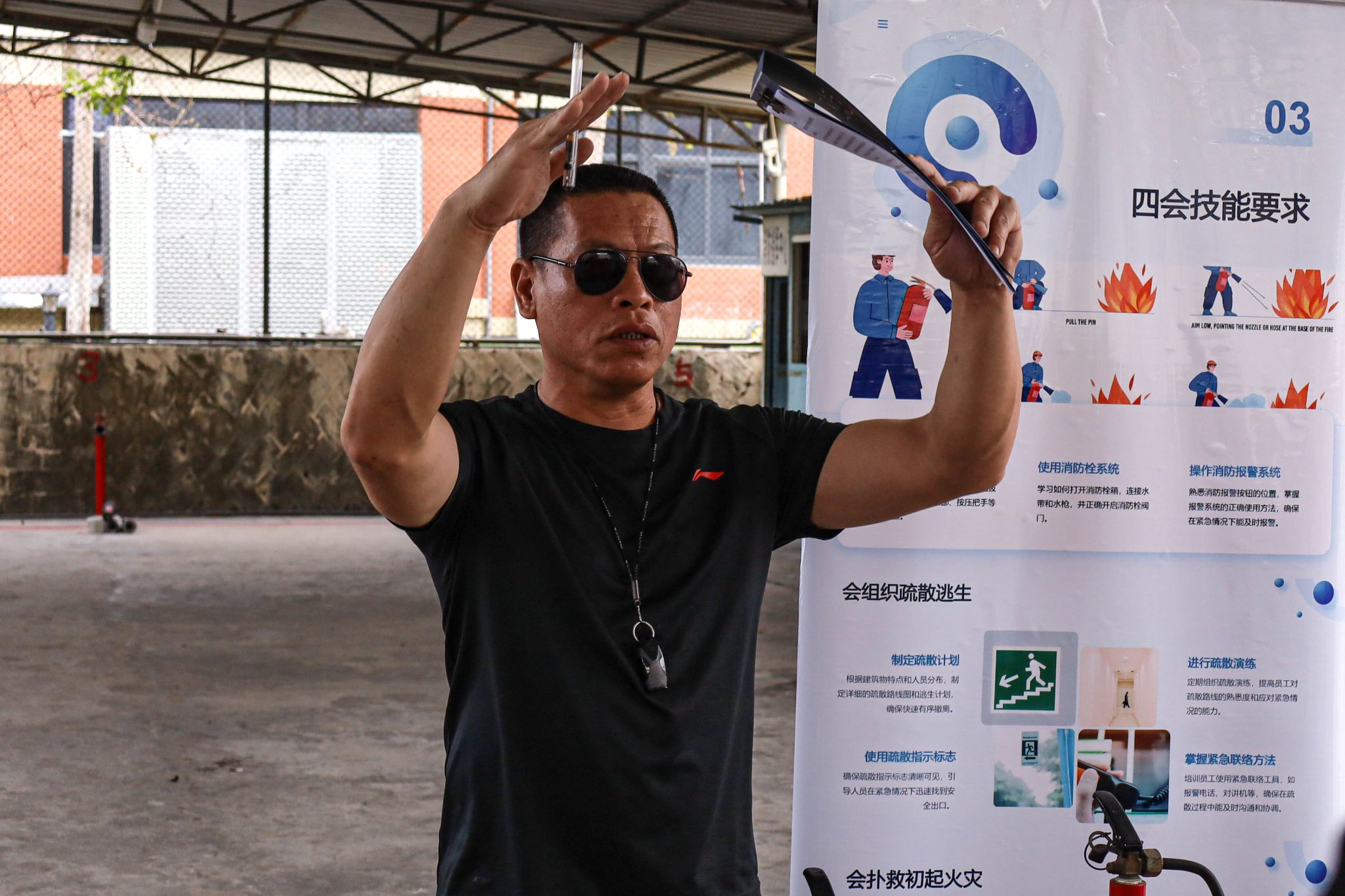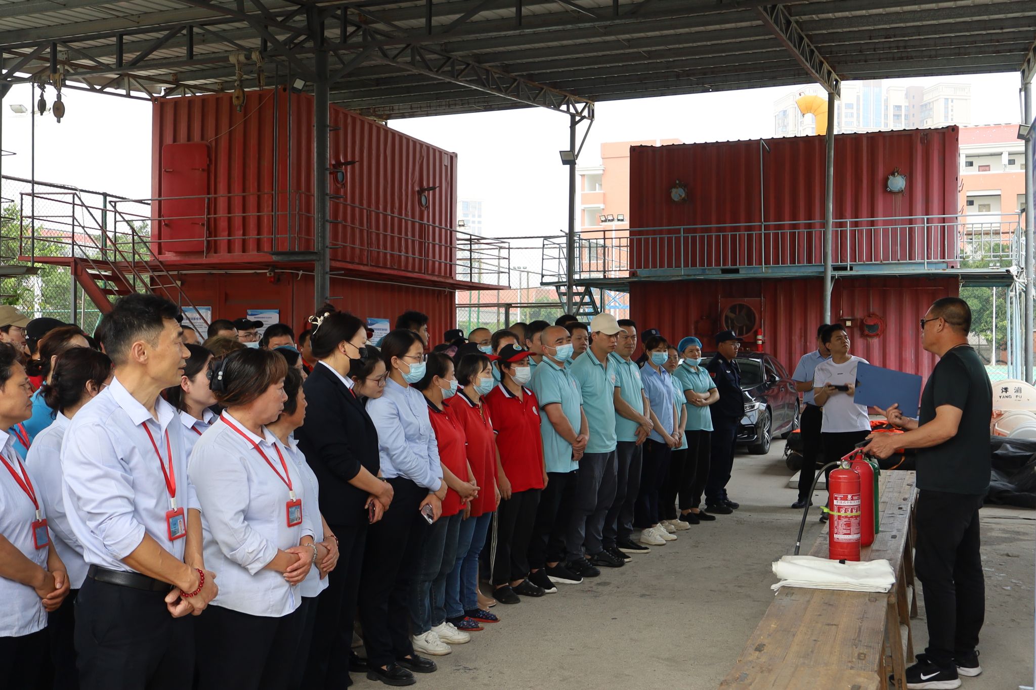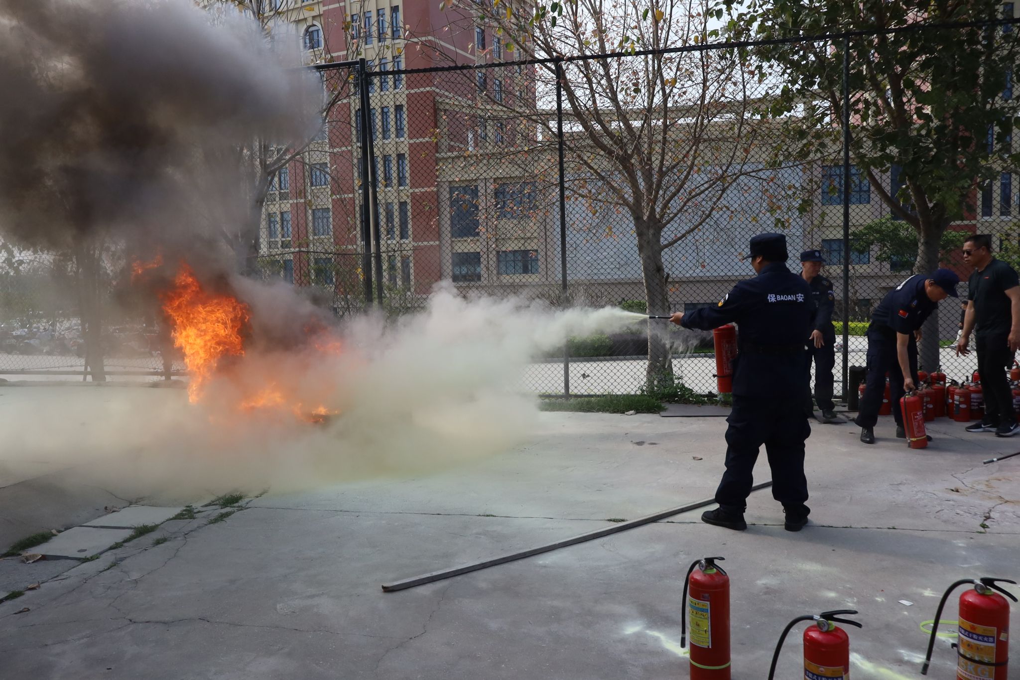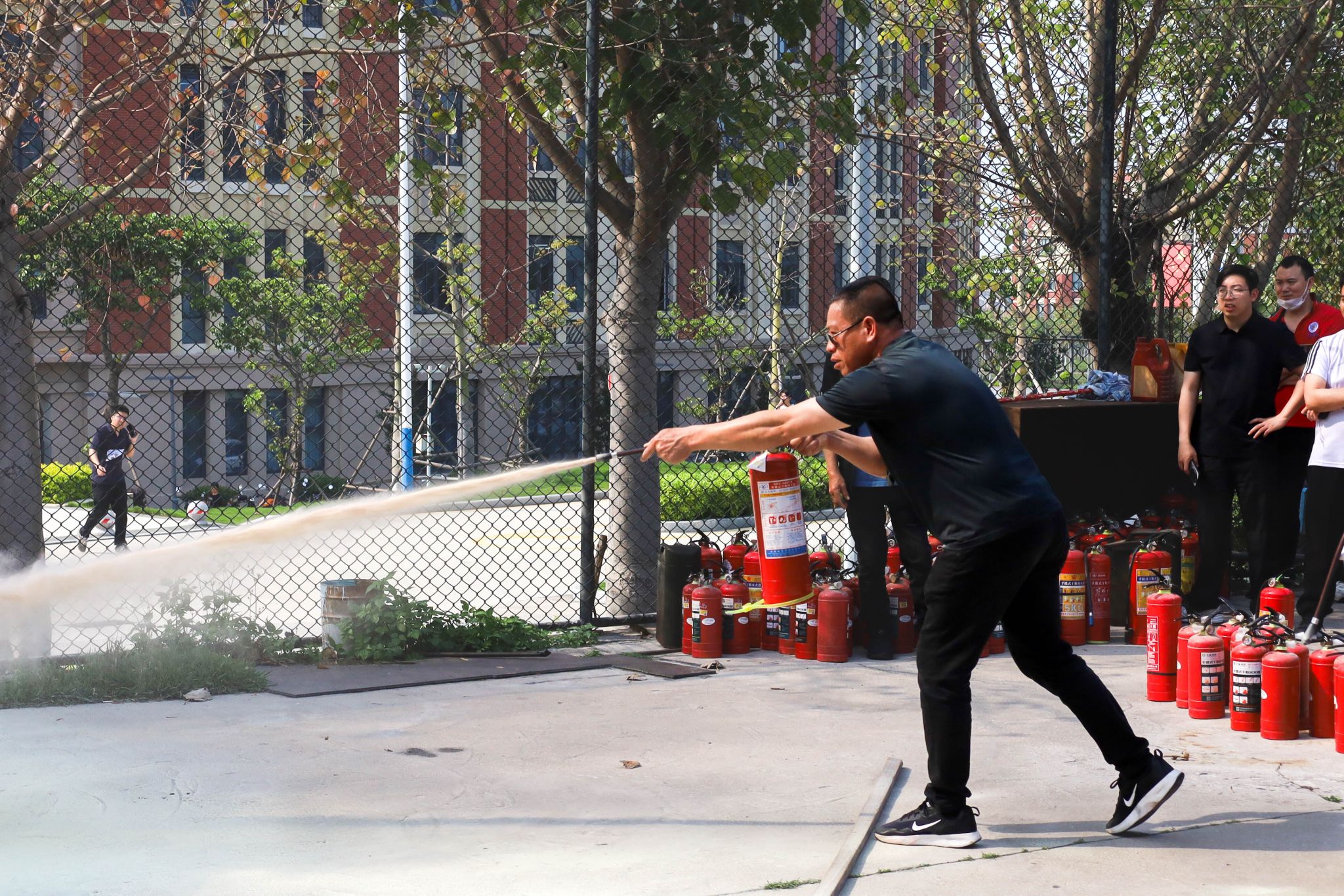 理论讲解结束后,培训进入实操环节。施天进老师与保安员共同开展消防水带现场演示,模拟火灾场景下快速连接消防水带与消火栓、开阀出水的操作流程,重点强调团队协作与应急反应速度的重要性。随后,参训人员分组进行灭火器实操演练,在施老师的指导下逐一完成灭火器操作,通过反复练习“提、拔、握、压”等规范动作,切实掌握火灾扑救的实战技能。