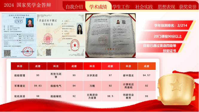 她立志以“有涯随无涯”,在专业学习上砥砺深耕,用有限的人生追求无限的知识。所以她不仅在课上认真学习,积极回答问题,还会在课余时间奔波在图书馆和自习室。“念念不忘,必有回响”,该生学期综测专业排名:1/214;学年综测专业排名:2/214;综测总分:95.83;平均学分绩点:3.69。“天行健,君子以自强不息”,她在进行本专业学习的同时,还利用课余时间考证。目前取得了英语四级、普通话水平测试、电工证等技能证书。