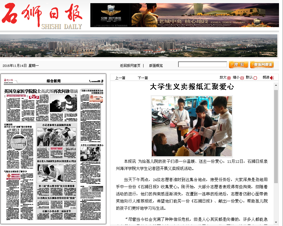 本报讯 为给孤儿院的孩子们添一分温暖、送去一份爱心,11月12日,石狮日报泉州海洋学院大学生记者团开展义卖报纸活动。 当天下午两点,24位志愿者准时到达集合地点,接受任务后,大家浑身是劲地用手中一份份《石狮日...