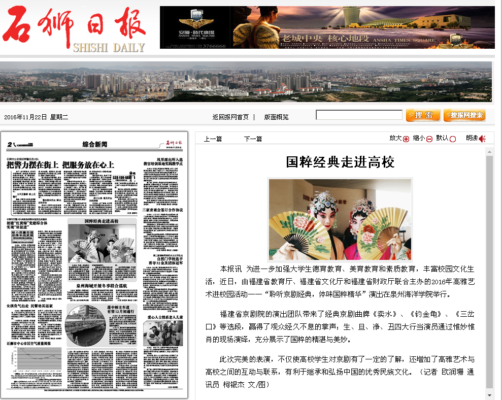 本报讯 为进一步加强大学生德育教育、美育教育和素质教育,丰富校园文化生活,近日,由福建省教育厅、福建省文化厅和福建省财政厅联合主办的2016年高雅艺术进校园活动——“聆听京剧经典,体味国粹精华”演出在泉州海...