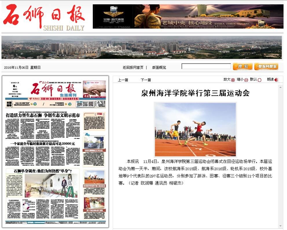 本报讯 11月4日,泉州海洋学院第三届运动会闭幕式在田径运动场举行。本届运动会为期一天半,期间,该校航海系2015级、航海系2016级、轮机系2015级、校外基地等9个代表队的297名运动员,分别参加了游泳、田赛、径赛三...