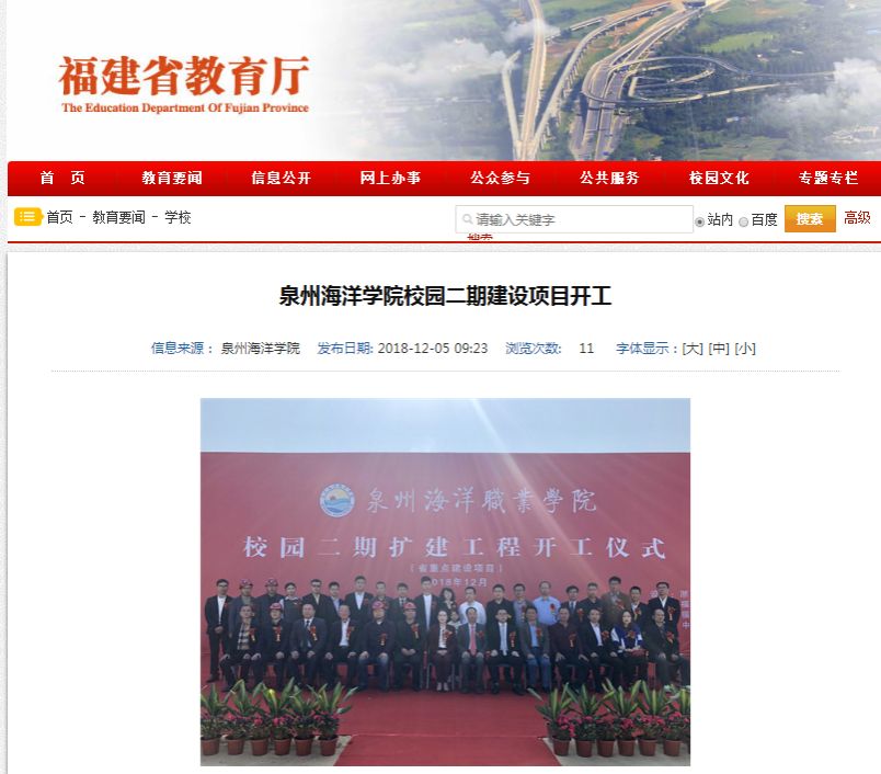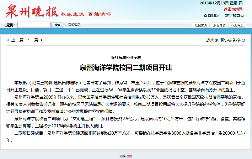 本报讯 (记者王树帆 通讯员陈珊婷)记者日前了解到,作为省、市重点项目,位于石狮祥芝镇的泉州海洋学院校园二期项目于近日开工建设。目前,项目“三通一平”已完成,正在进行8#、9#学生宿舍楼以及3#食堂的场地平整...
