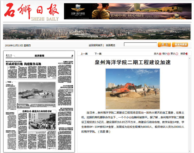 连日来,泉州海洋学院二期建设工程现场呈现出一派热火朝天的施工景象,在推土机、挖掘机等机器联合作业下,一个个小山包瞬间被推平。据了解,泉州海洋学院二期建设工程投资2.5亿元,建设面积为9.85万平方米,将建设行...