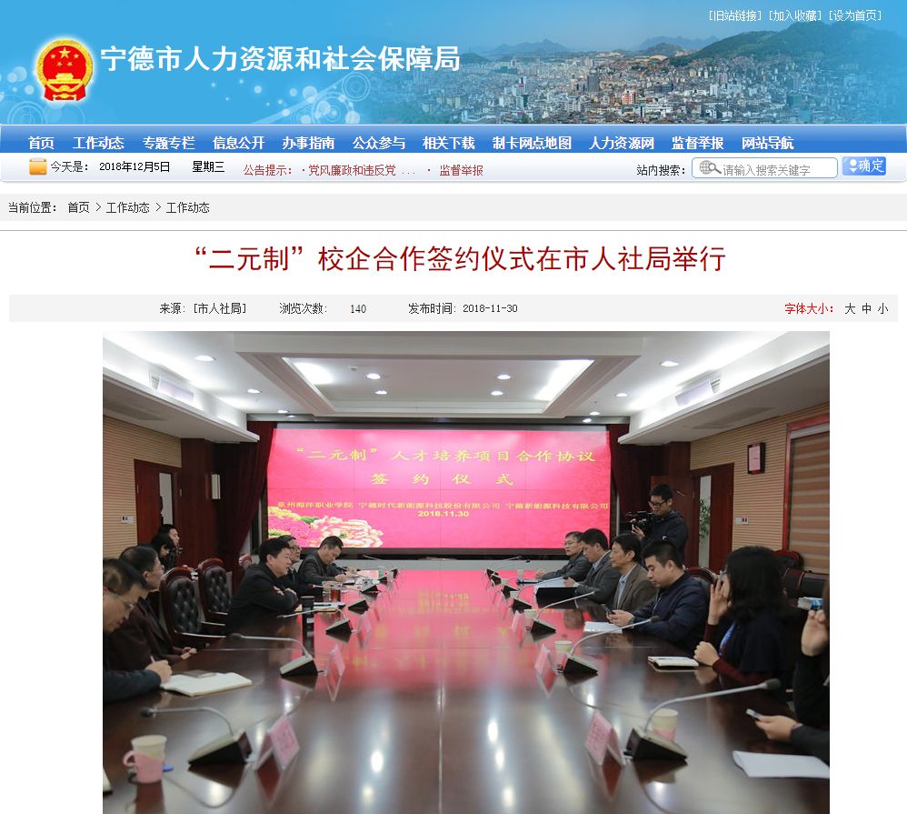 11月30日上午,在市人社局的对接下,宁德时代新能源科技股份有限公司、宁德新能源科技有限公司与泉州海洋职业学院成功举行“二元制”校企合作签约仪式。参加本次签约仪式有宁德市人社局党组书记、局长陈幸、泉州海洋...