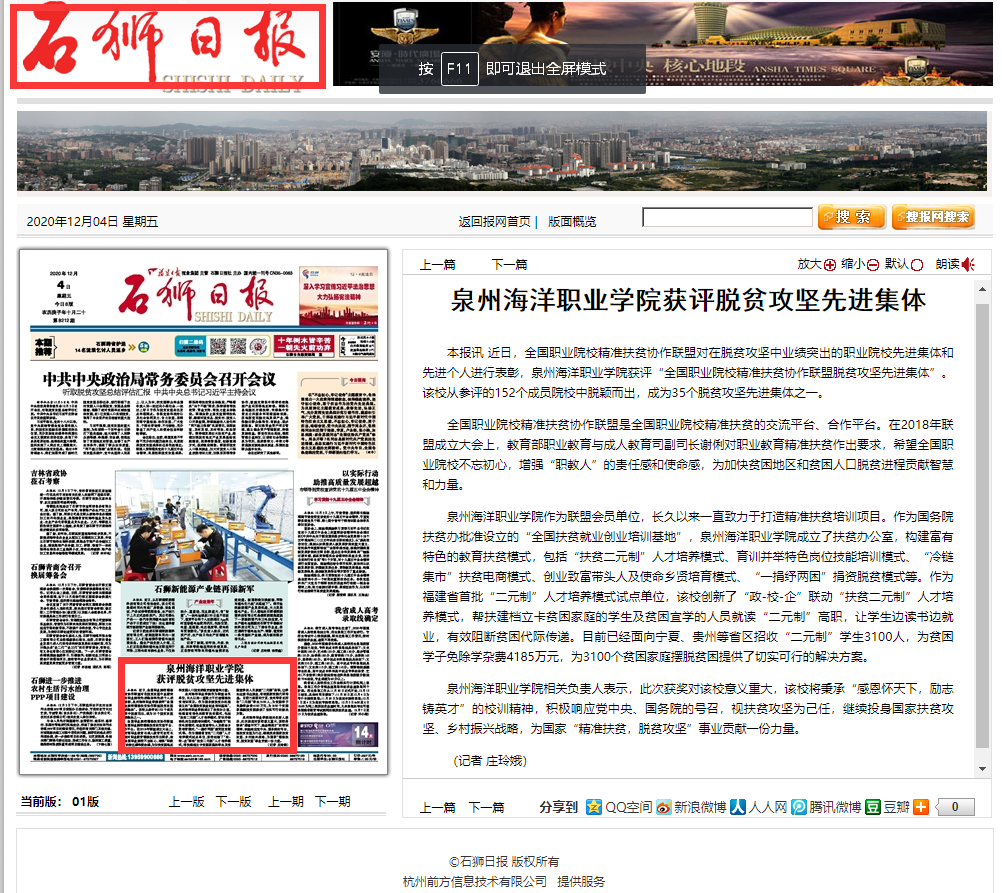 【石狮日报】泉州海洋职业学院获评脱贫攻坚先进集体