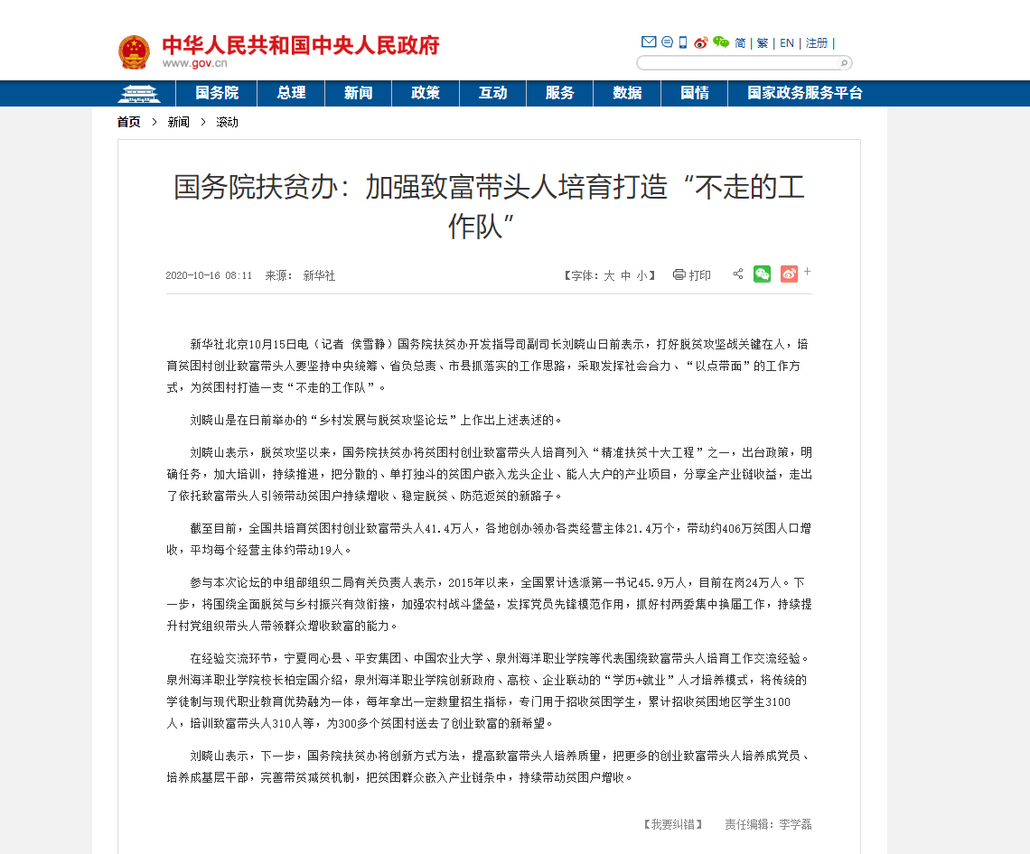 国务院扶贫办:加强致富带头人培育打造“不走的工作队”