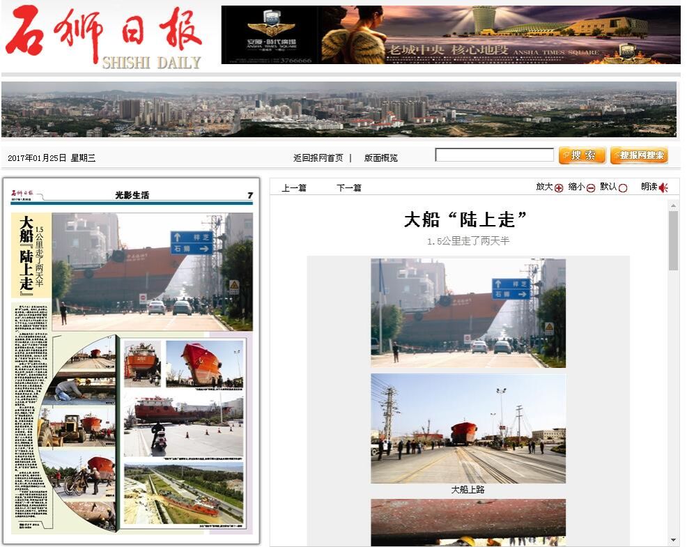 石狮日报讯 霸气十足!重达260吨的大船“开”上公路。这两天,在石狮大道古浮段,一艘长近50米、型宽9.2米、高约12.5米的载油货轮“横空出世”,令人仿佛走进“好莱坞”片场。从1月22日上午8点到1月24日中午12点,1....