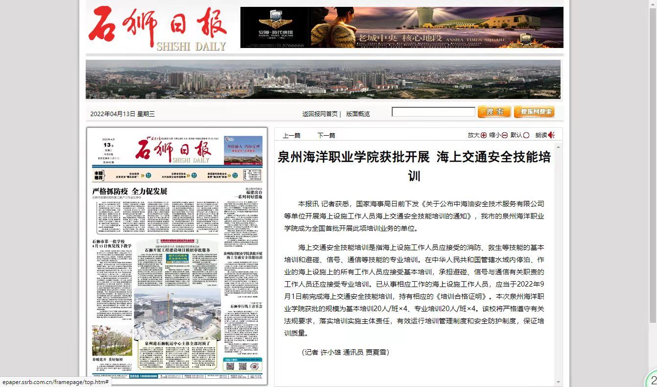 【石狮日报】泉州海洋职业学院获批开展 海上交通安全技能培训