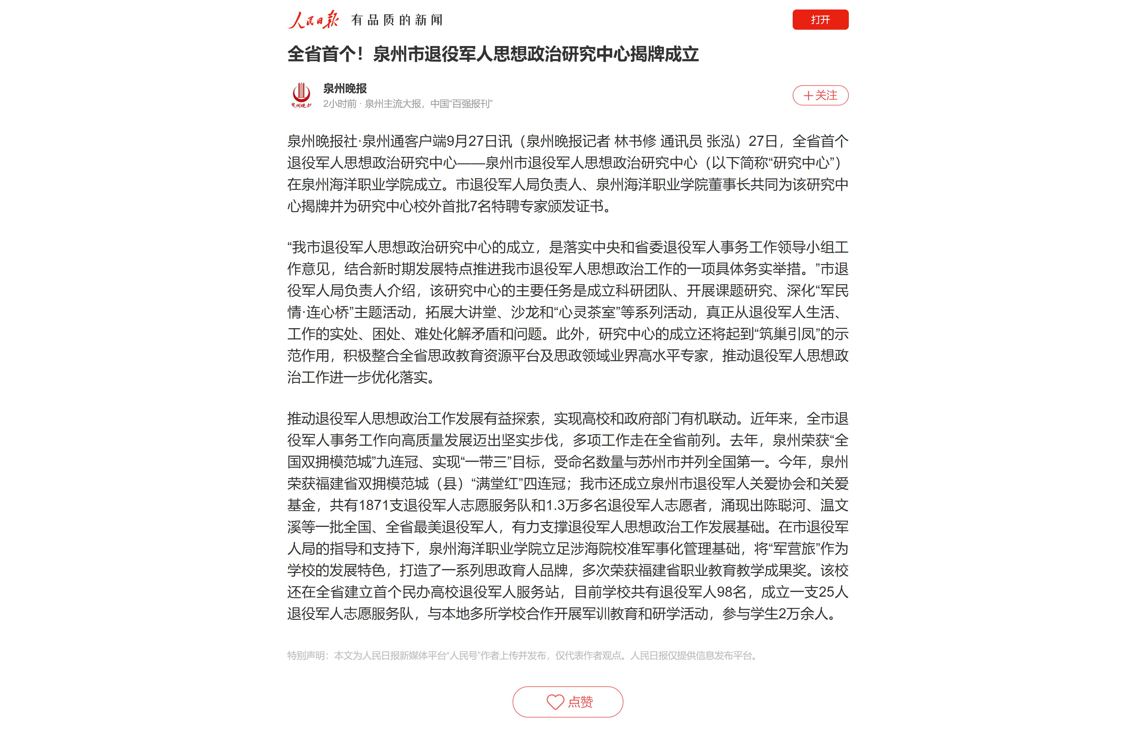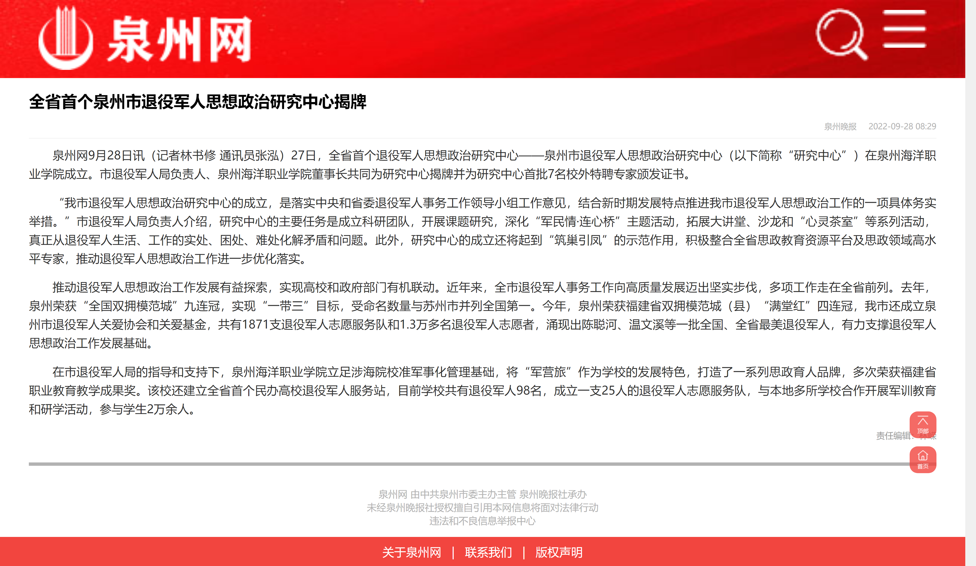 (新闻中心讯 记者许小雄供稿 校党委宣传部报道)日前,泉州市退役军人事务局与泉州海洋职业学院共建泉州市退役军人思想政治研究中心签约暨揭牌仪式举行,标志着全省第一家退役军人思政研究中心正式落户泉州海洋职业...