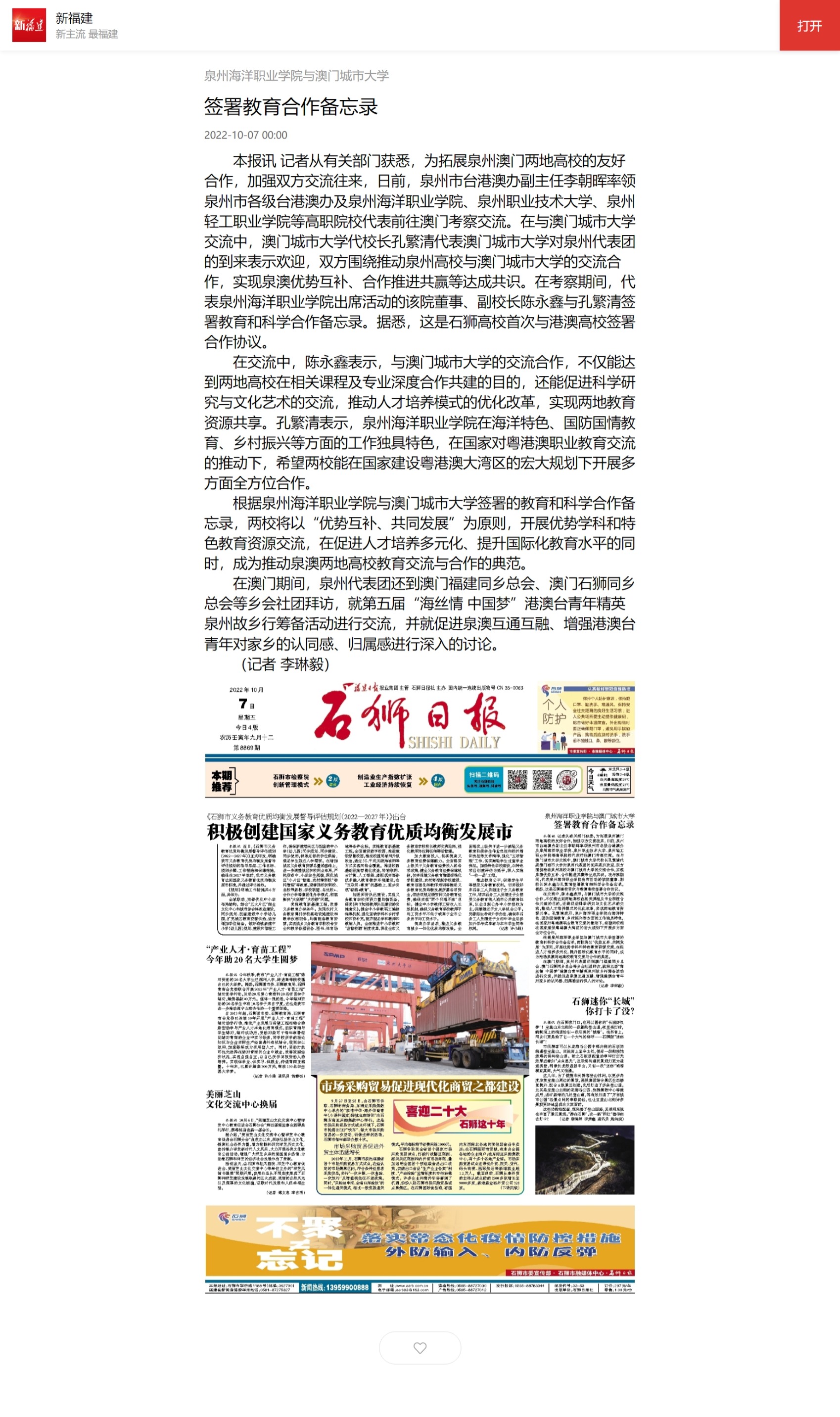 (新闻中心讯 记者李琳毅供稿 校党委宣传部报道)记者从有关部门获悉,为拓展泉州澳门两地高校的友好合作,加强双方交流往来,日前,泉州市台港澳办副主任李朝晖率领泉州市各级台港澳办及泉州海洋职业学院、泉州职业...
